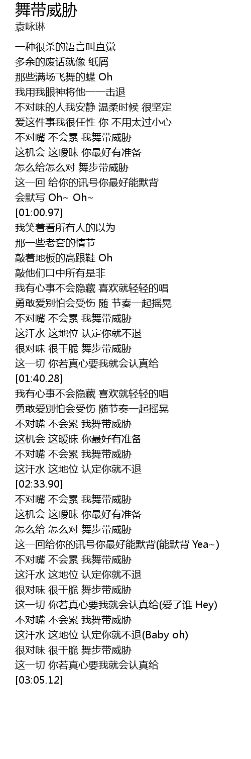 | [00:43.11] | 不对嘴 不会累 我舞带威胁 |