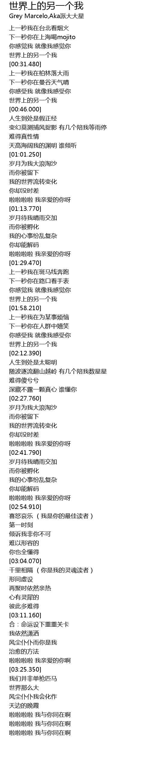| [00:28.260] | shì jiè shang de lìng yí gè wǒ |