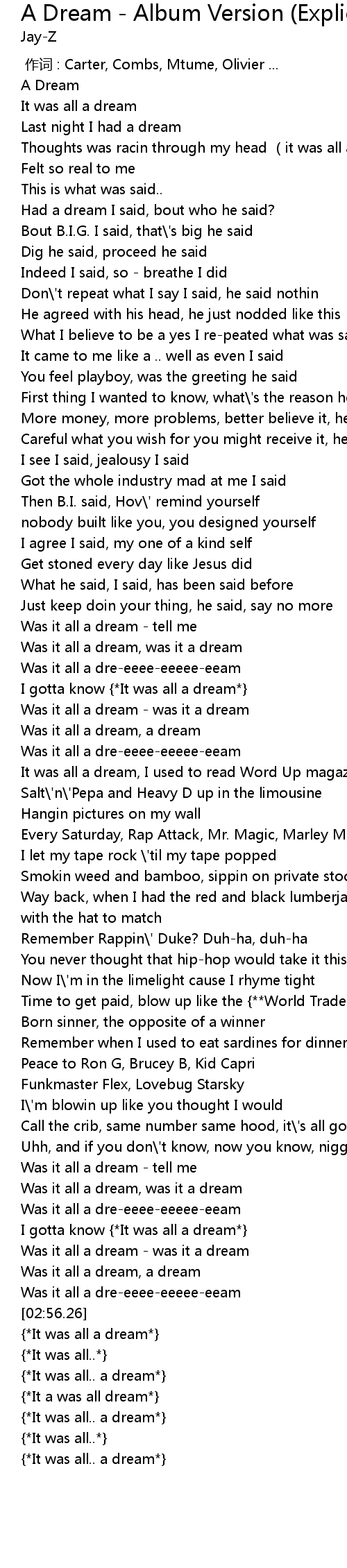 | [02:46.76] | I gotta know {*It was all a dream*} |