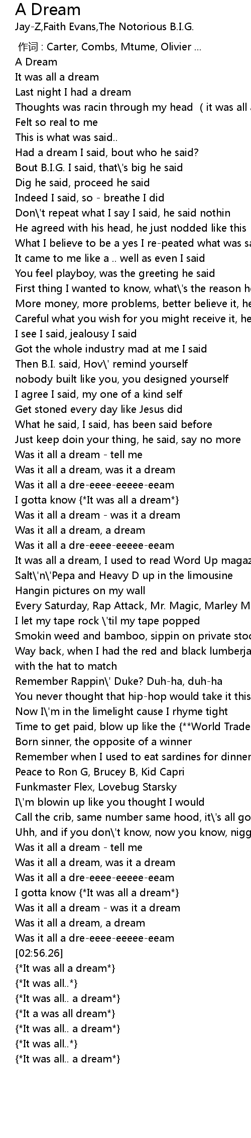 | [02:46.76] | I gotta know {*It was all a dream*} |