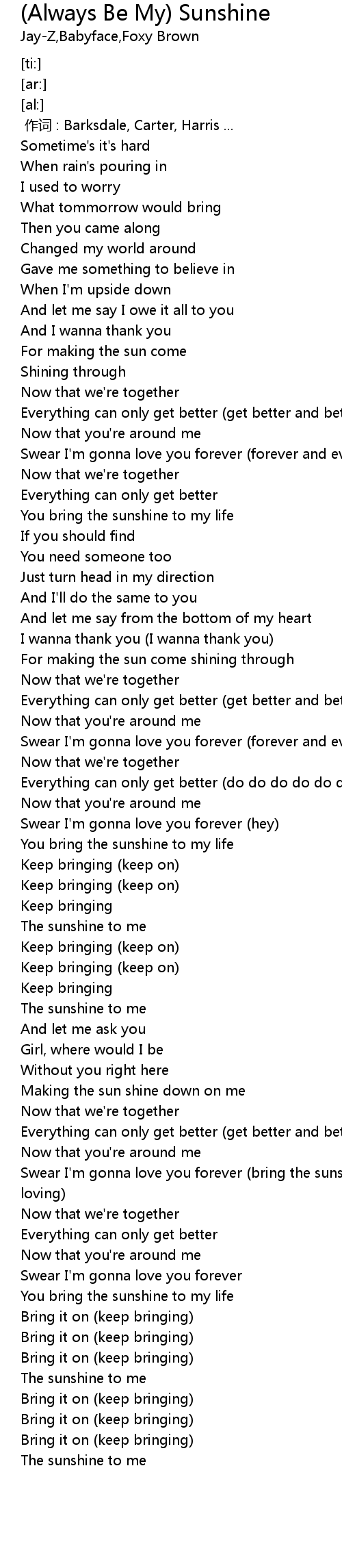 | [03:10.15] | Swear I' m gonna love you forever bring the sunshine, bring the loving |