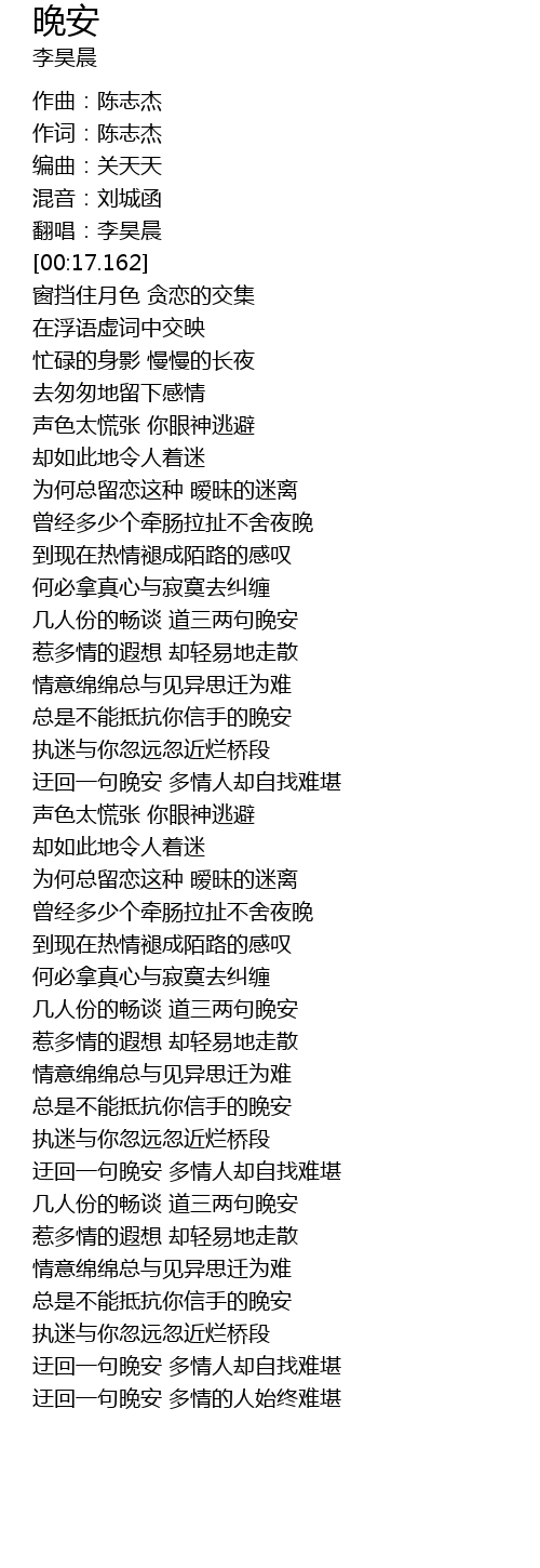 | [01:41.418] | 迂回一句晚安 多情人却自找难堪 |