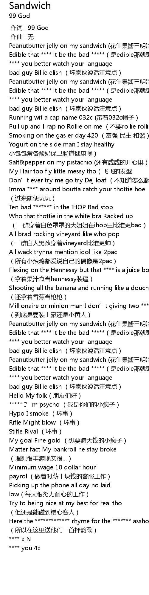 | [00:19.461] | Edible that **** it be the bad *****(是edible那就更好了) |