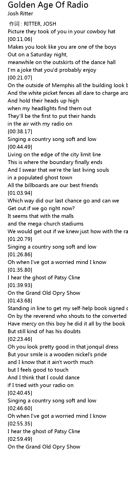 | [01:37.24] | I hear the ghost of Patsy Cline |
