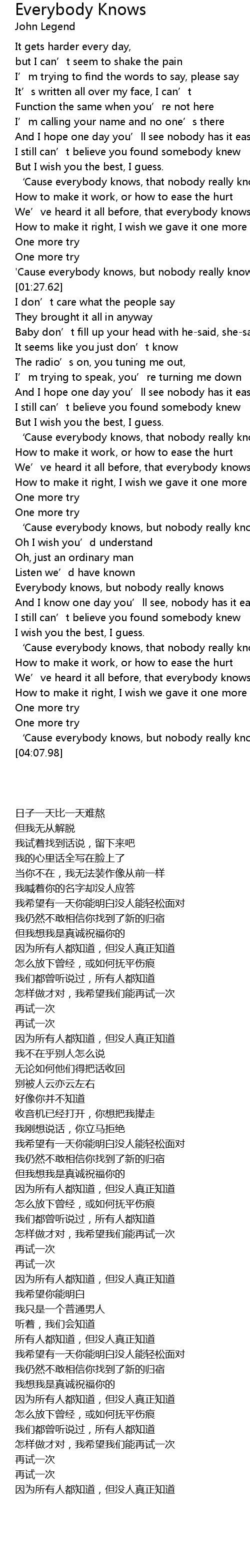 | [01:21.20] | ' Cause everybody knows, but nobody really knows |