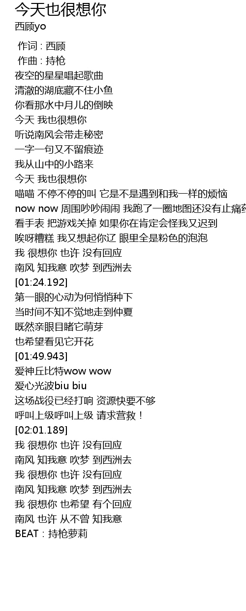 | [02:01.440] | 我 很想你 也许 没有回应 |