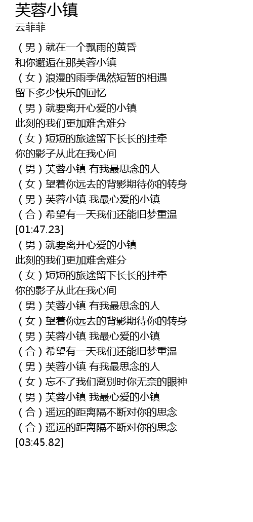 | [03:20.79] | (男)芙蓉小镇 我最心爱的小镇 |