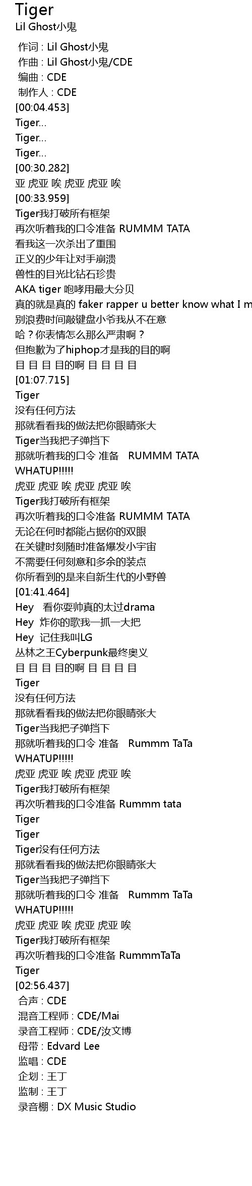 | [00:34.158] | Tiger wǒ dǎ pò suǒ yǒu kuàng jià |