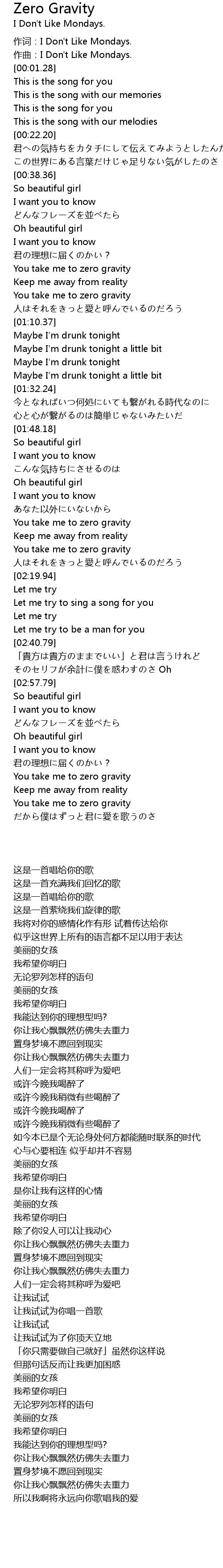 | [02:03.65] | You take me to zero gravity |