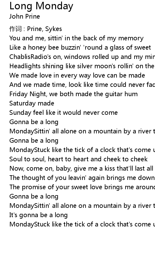 | MondaySittin' all alone on a mountain by a river that has no end | |