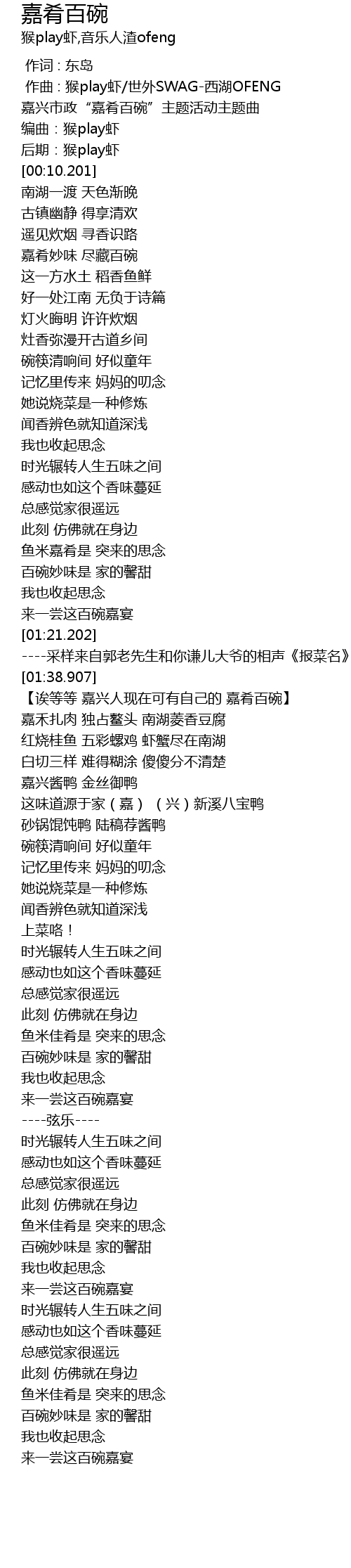 | [00:03.197] | 嘉兴市政“嘉肴百碗”主题活动主题曲 |
