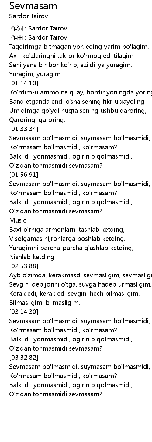 | [00:01.000] | zuò qǔ : Sardor Tairov |