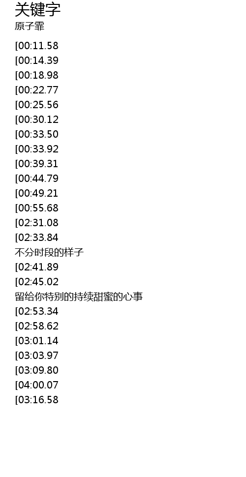 | [03:18.19][02:31.08][00:56.04] | 属於我的关键字 可以是一段诗 |