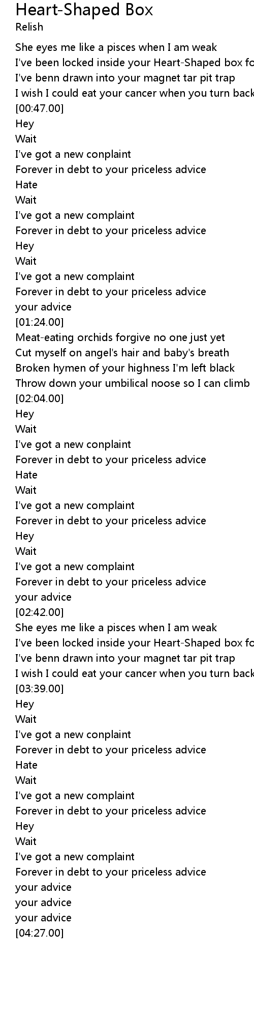 [03:13.00] I've been locked inside your Heart-Shaped box for a week