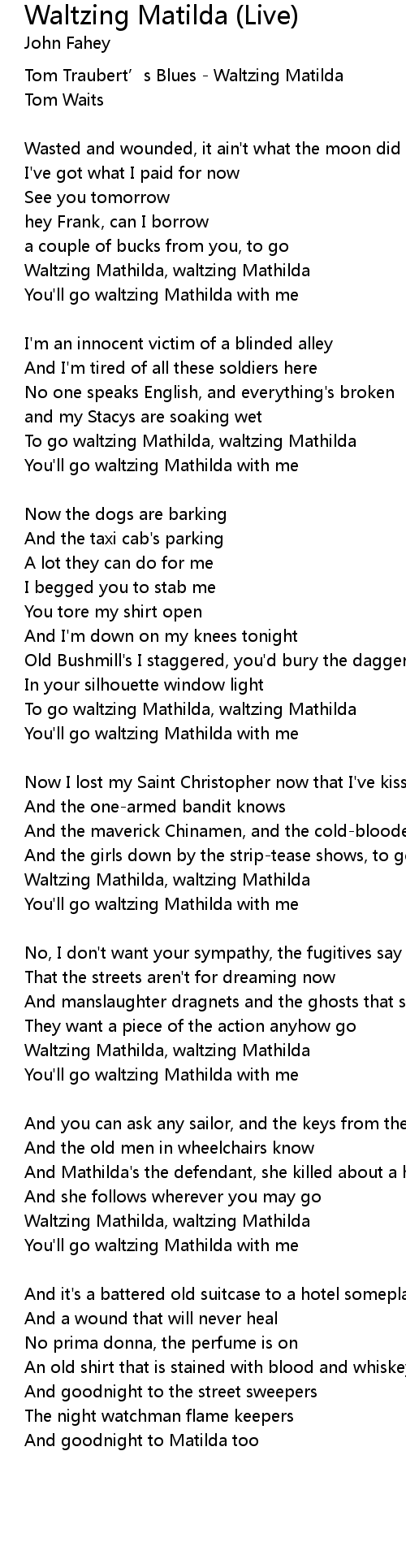 | Tom Traubert' s Blues Waltzing Matilda | |