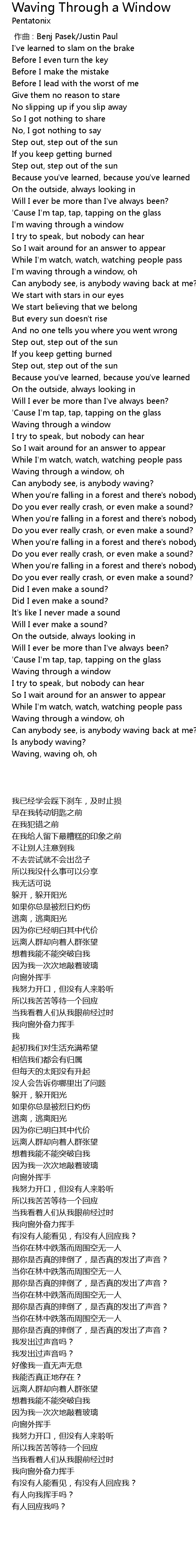 | [02:17.495] | Waving through a window, oh |