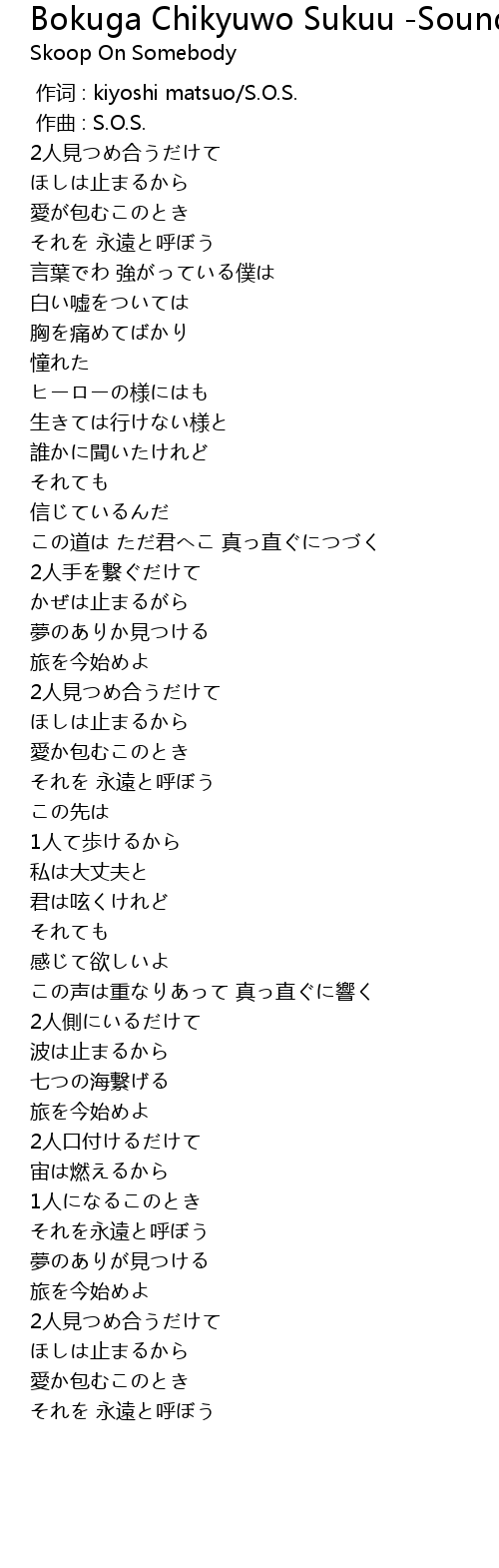| [00:00.000] | 作词 : kiyoshi matsuo/S.O.S. |