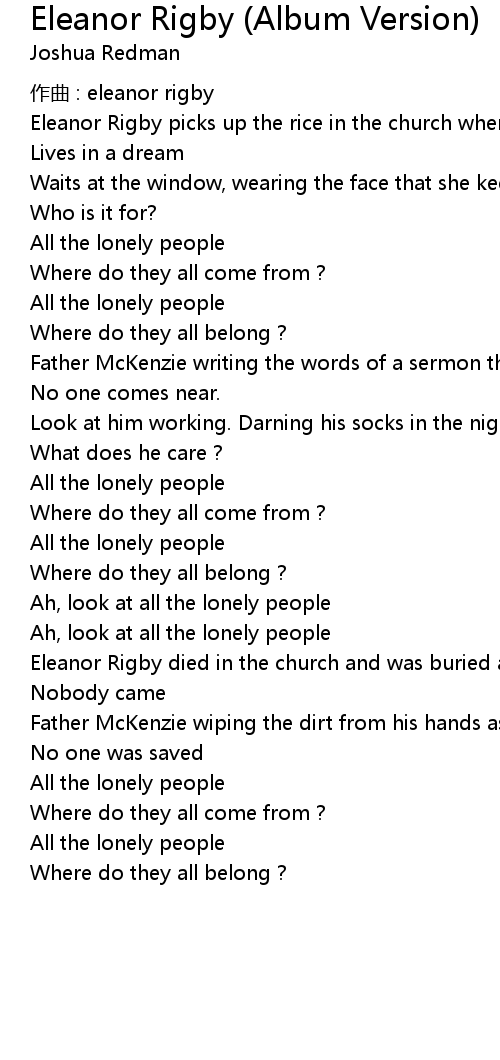 | Eleanor Rigby died in the church and was buried along with her name | |
