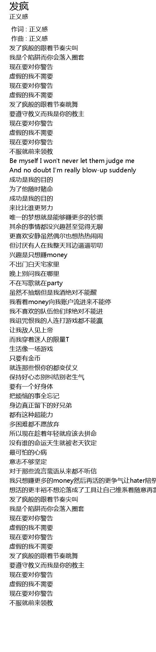 | [02:15.127] | 我只想赚更多的money然后再活的更争气让hater陪祭不回忆那没劲的破事情 |