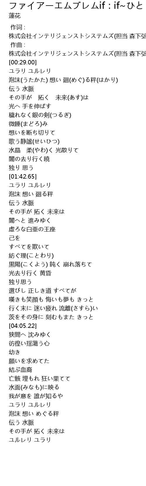 | [00:01.000] | 作曲 : 株式会社インテリジェンストシステムズ(担当 森下弘生) |
