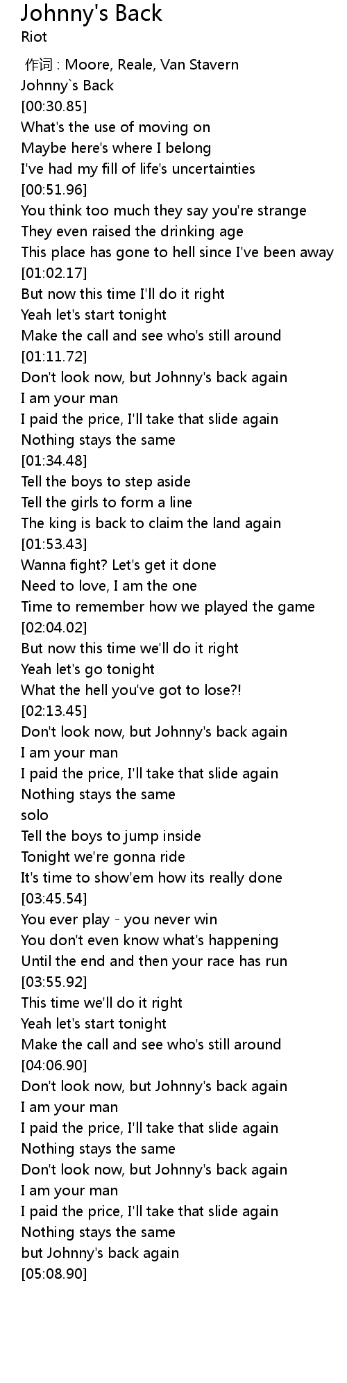 | [04:26.91] | Don't look now, but Johnny's back again |