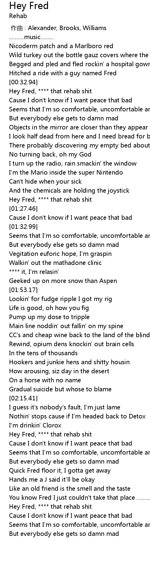 | [03:09.74] | Hey Fred, **** that rehab shit |