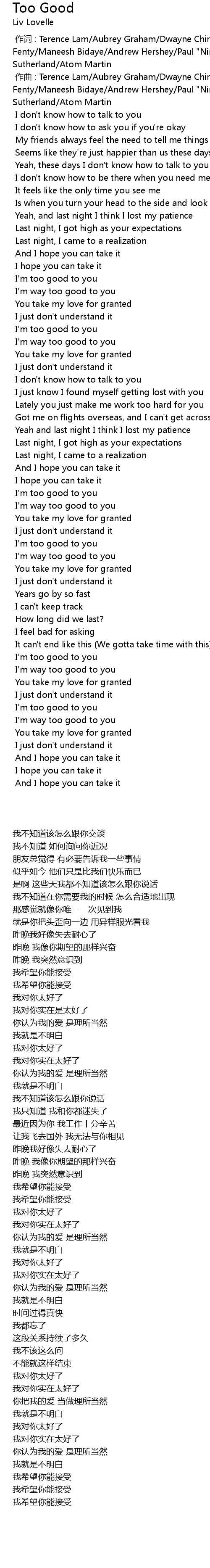 | [00:00.000] | 作词 : Terence Lam/Aubrey Graham/Dwayne Chin-Quee/Robyn Fenty/Maneesh Bidaye/Andrew Hershey/Paul "Nineteen85" Jefferies/Andre Sutherland/Atom Martin |