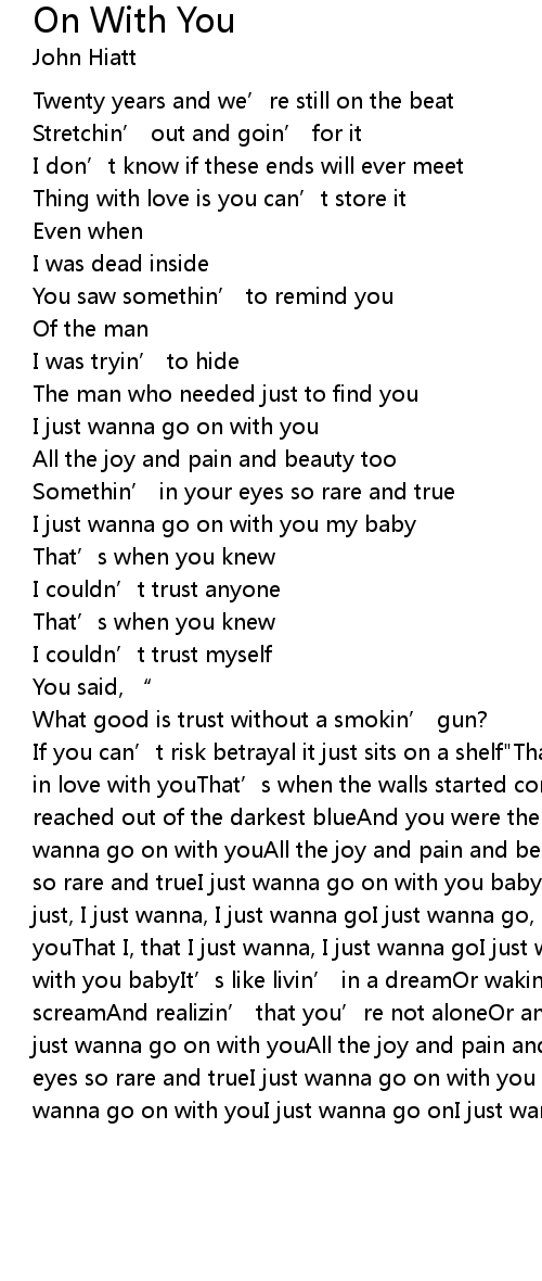 | If you can’t risk betrayal it just sits on a shelf"That’s when I knew I was in love with youThat’s when the walls started comin’ downThat’s when I reached out of the darkest blueAnd you were there to bring me back aroundI just wanna go on with youAll the joy and pain and beauty tooSomethin’ in your eyes so rare and trueI just wanna go on with you babyI just wanna go on with youI just, I just wanna, I just wanna goI just wanna go, I just wanna go on with youThat I, that I just wanna, I just wanna goI just wanna go, I just wanna go on with you babyIt’s like livin’ in a dreamOr wakin’ up in the middle of a screamAnd realizin’ that you’re not aloneOr anyway the boogie man went homeI just wanna go on with youAll the joy and pain and beauty tooSomethin’ in your eyes so rare and trueI just wanna go on with you babyI just wanna go onI just wanna go on with youI just wanna go onI just wanna, I just wanna baby |