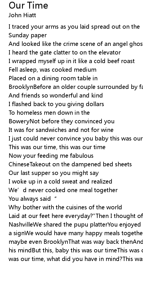 | Laid at our feet here everyday?" Then I thought of our first date back in NashvilleWe shared the pupu platterYou enjoyed it with such gusto I took it for a signWe would have many happy meals togetherIn a warm dining room somewhere maybe even BrooklynThat was way back thenAnd I was just another guy with food on his mindBut this, baby this was our timeThis was our time, this was our timeThis was our time, what did you have in mind? This was our time |