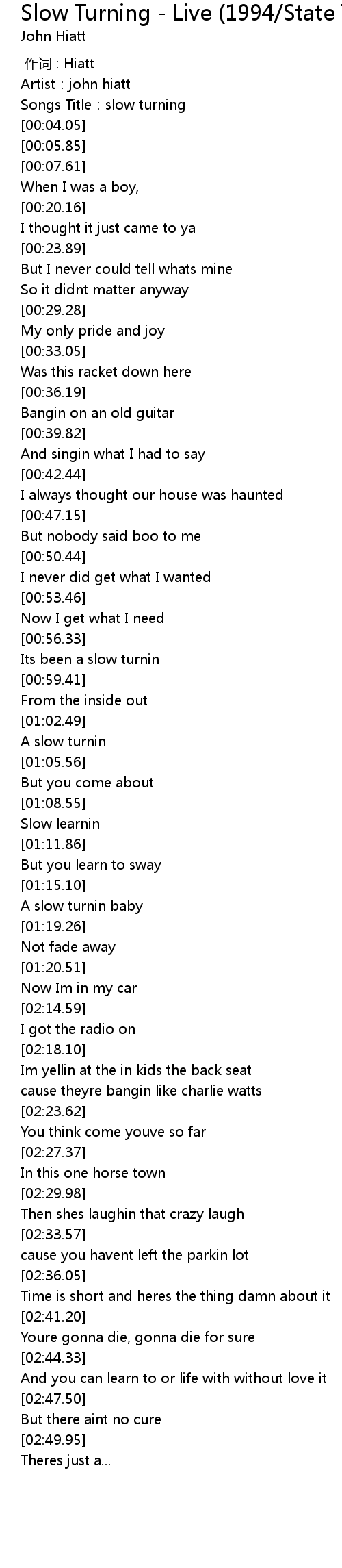 | [00:01.22] | Artist: john hiatt |