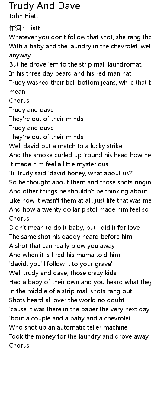 | Trudy washed their bell bottom jeans, while that baby just sat there lookin' mean | |