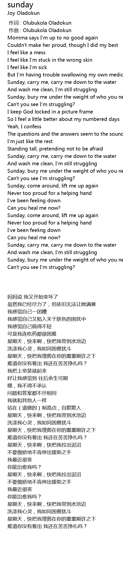| [01:41.80] | Sunday, carry me, carry me down to the water |