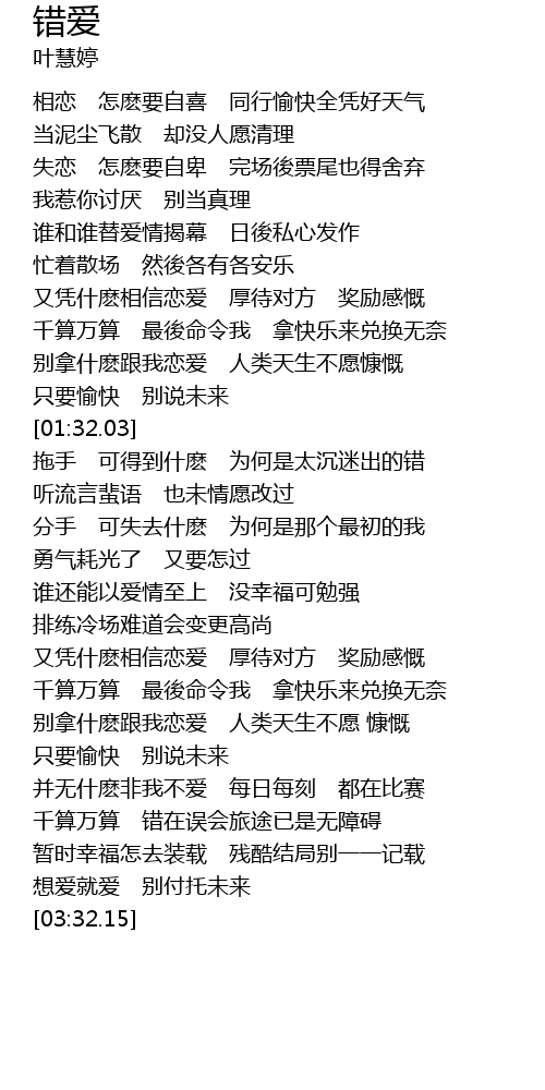 | [00:32.12] | 失恋 怎麽要自卑 完场後票尾也得舍弃 |