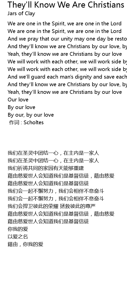 | [1:19] | Yeah, they' ll know we are Christians by our love |