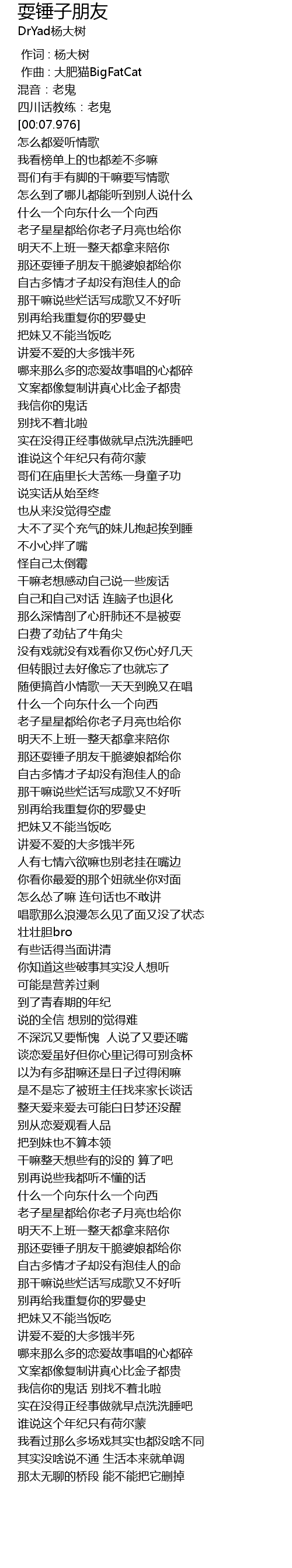 | [00:14.990] | 哥们有手有脚的干嘛要写情歌 |