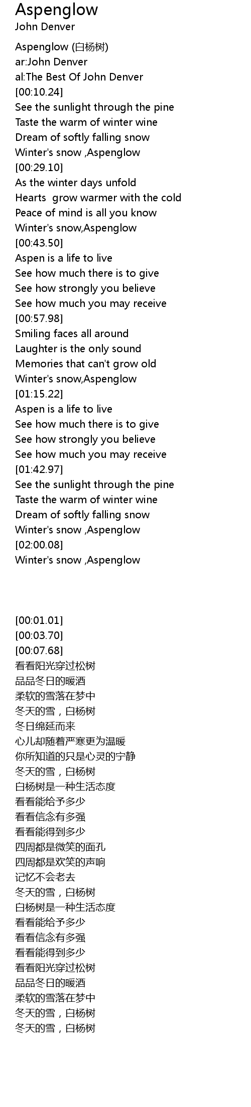 | [00:39.78] | Winter's snow,Aspenglow |