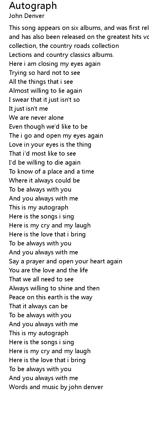 This song appears on six albums, and was first released on the autograph album, and has also been released on the greatest hits vol 3, the rocky mountain collection, the country roads collection |