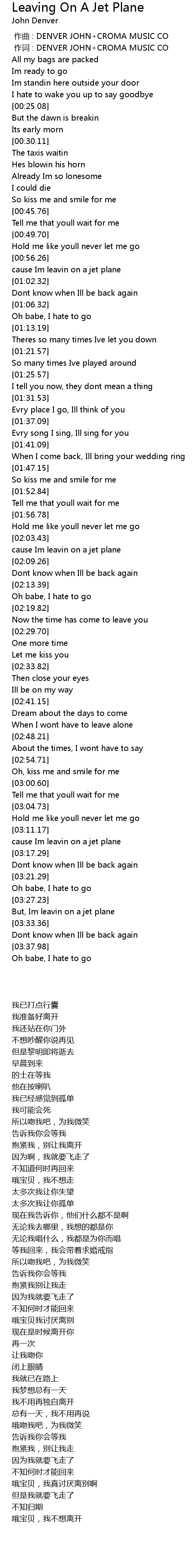 | [03:13.11] | cause Im leavin on a jet plane |