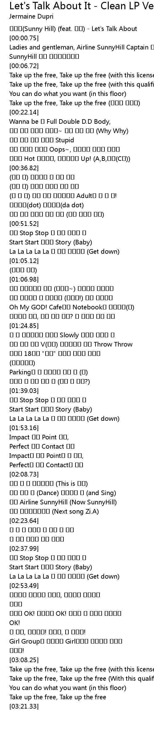 | [00:00.19] | 써니힐(Sunny Hill) (feat. 지아) - Let's Talk About |