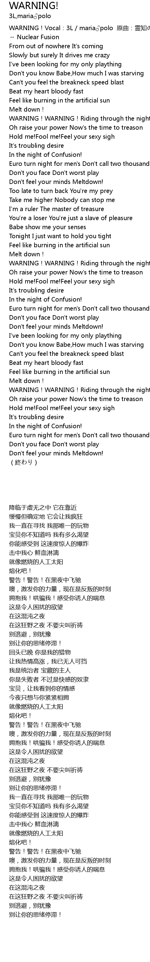 | [00:00.30] | WARNING!Vocal:3L / maria♂polo 原曲:霊知の太陽信仰 ~ Nuclear Fusion |
