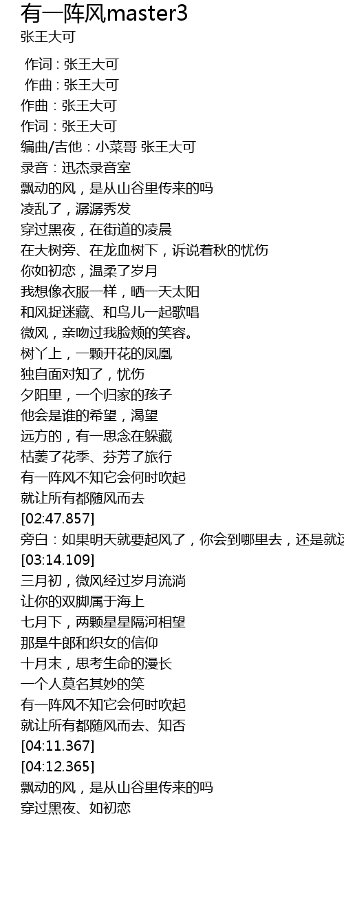 | [03:55.866] | 有一阵风不知它会何时吹起 |
