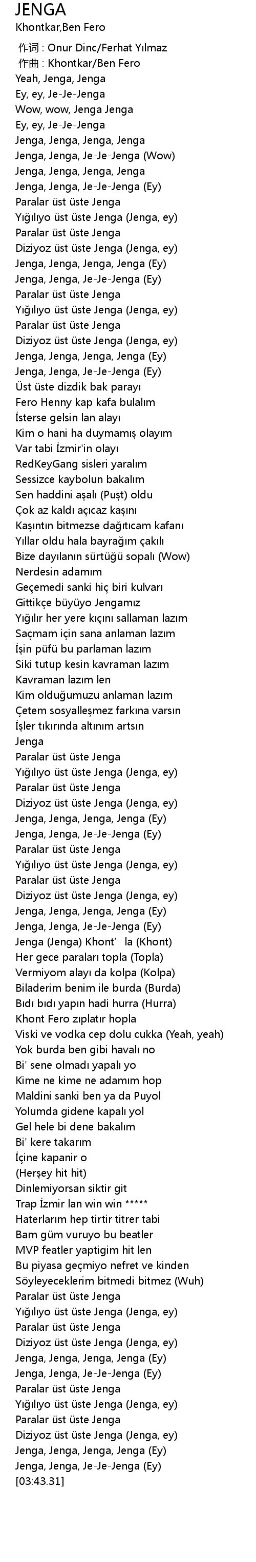 | [03:32.94] | Diziyoz ü st ü ste Jenga Jenga, ey |