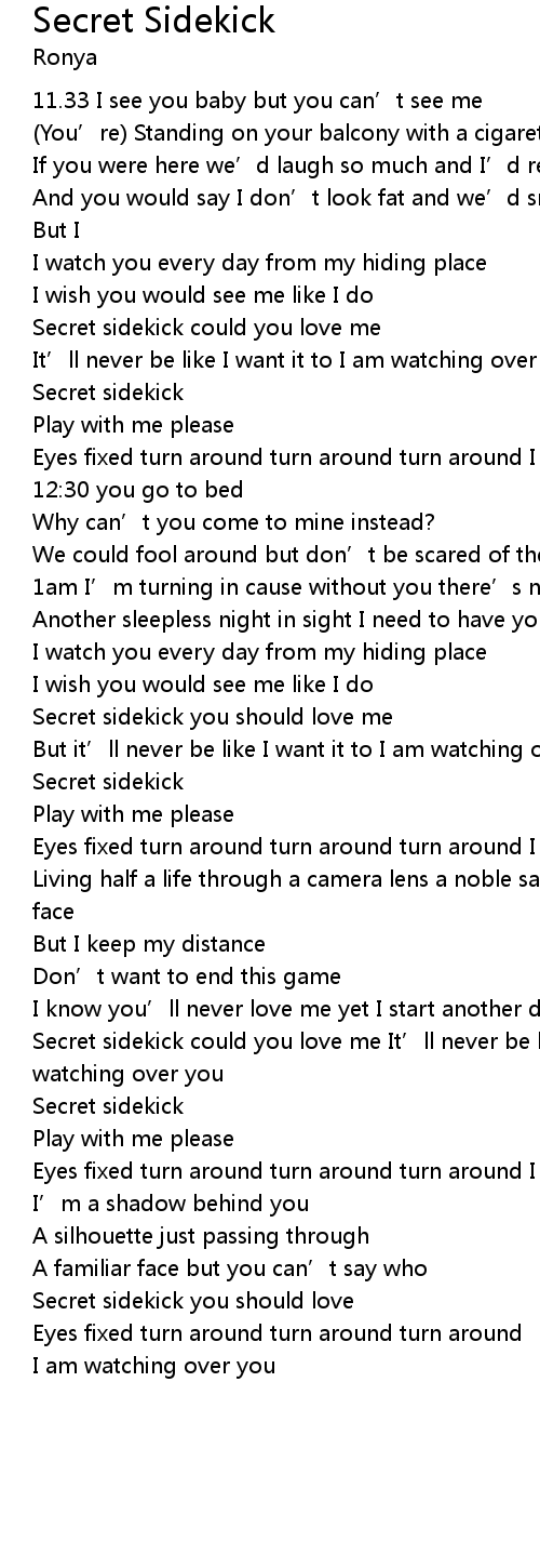 | Secret sidekick could you love me It’ll never be like I want it to I am watching over you | |