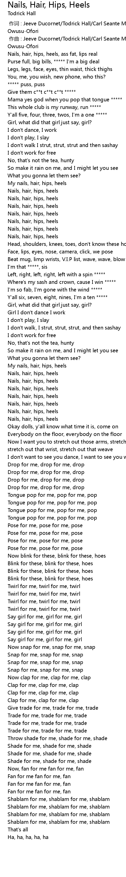 | [00:07.75] | Nails, hair, hips, heels, ass fat, lips real |
