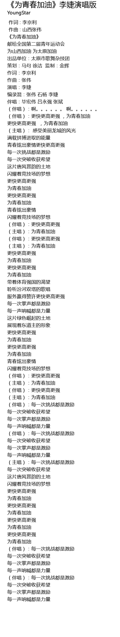 | [00:29.735] | gèng kuài gèng gāo gēng qiáng , wèi qīng chūn jiā yóu |