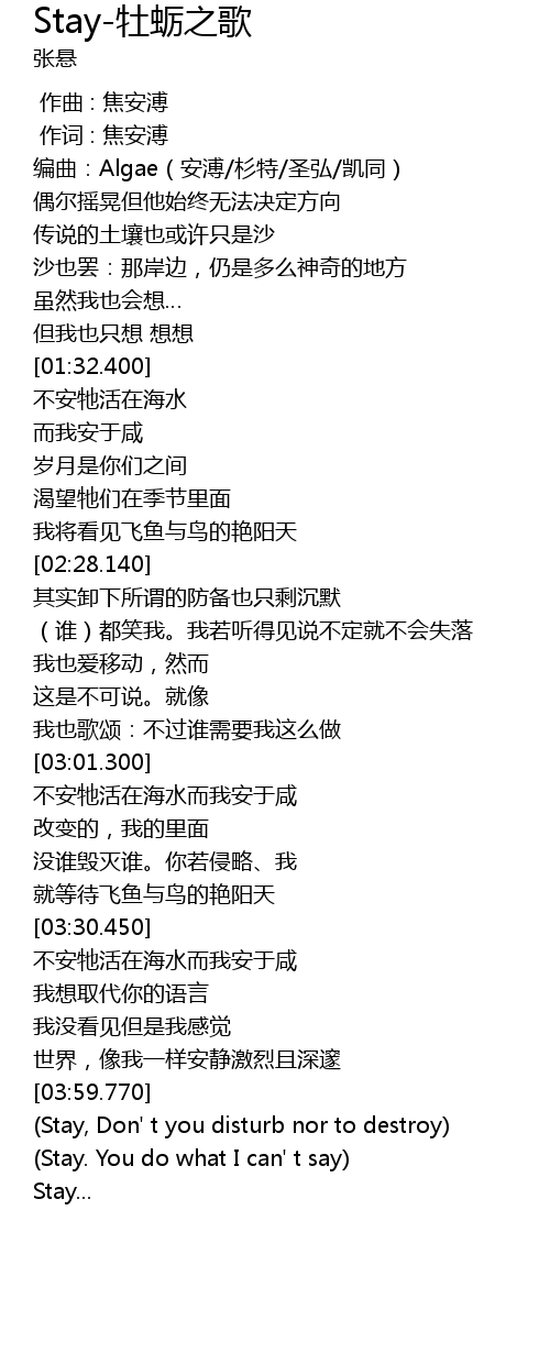 | [03:01.700] | bù ān tā huó zài hǎi shuǐ ér wǒ ān yú xián |
