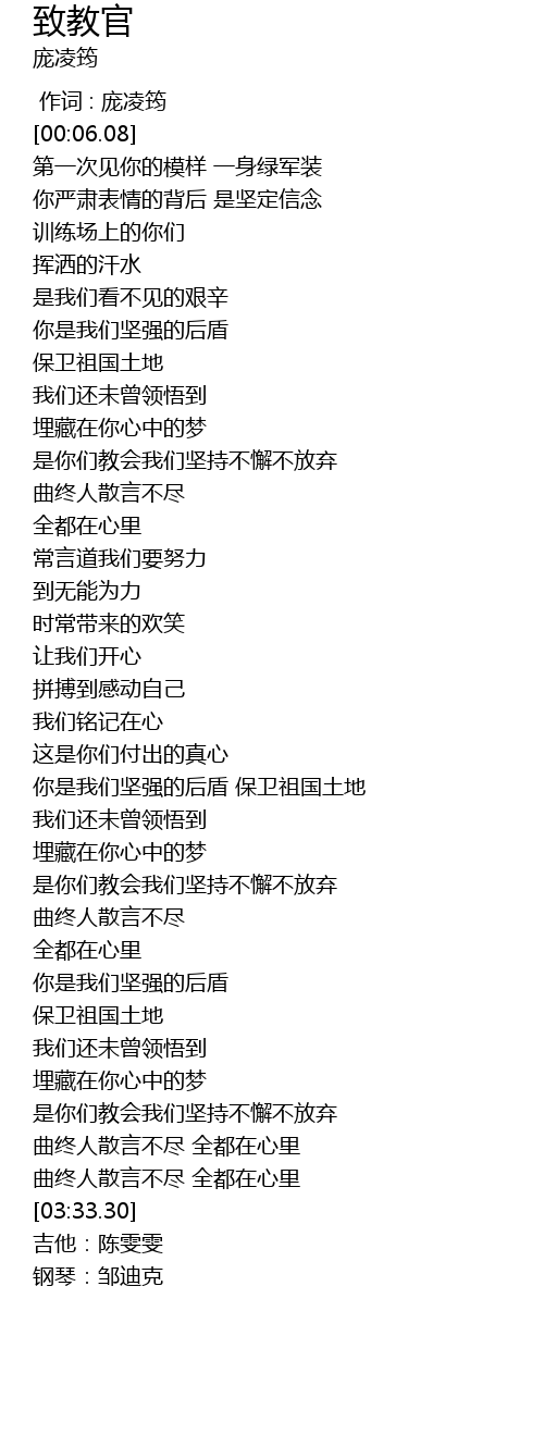 | [02:08.09] | 你是我们坚强的后盾 保卫祖国土地 |