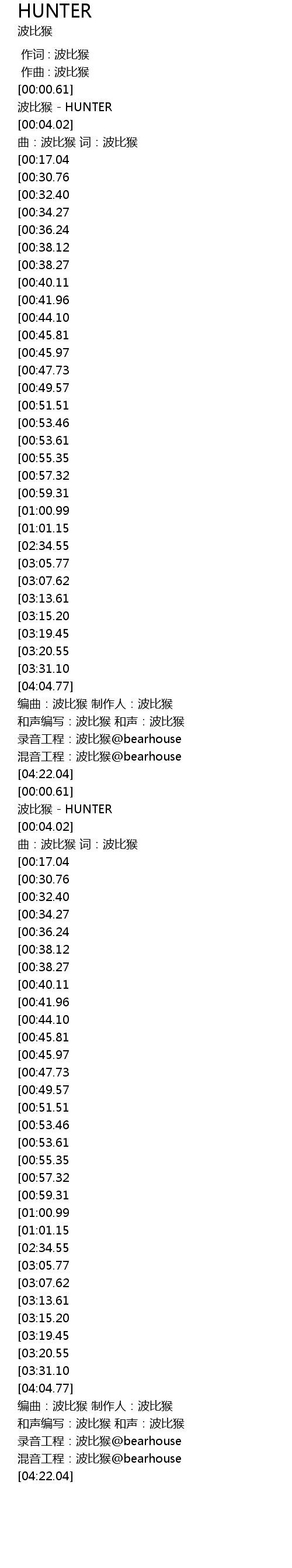 | [00:01.02] | bo bi hou HUNTER |