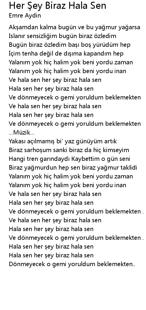 | [02:50.38] | Hala sen her şey biraz hala sen |