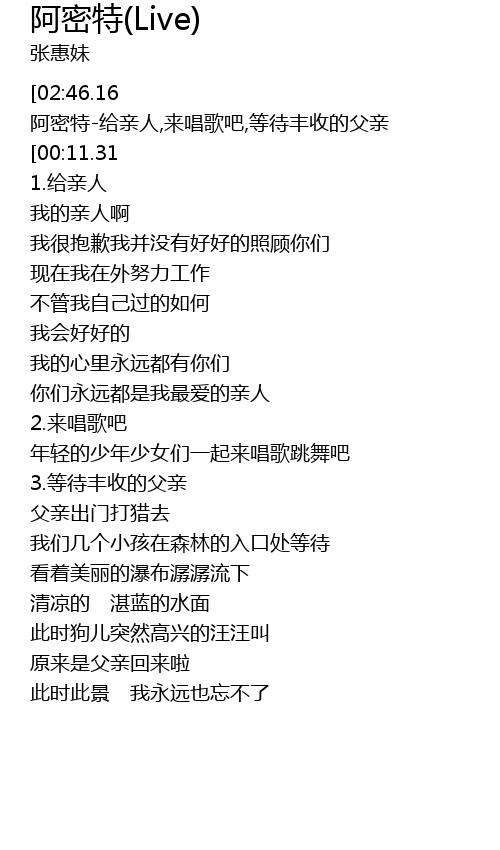| [03:15.45][02:46.16][00:00.00] | 张惠妹 阿密特-给亲人,来唱歌吧,等待丰收的父亲 |
